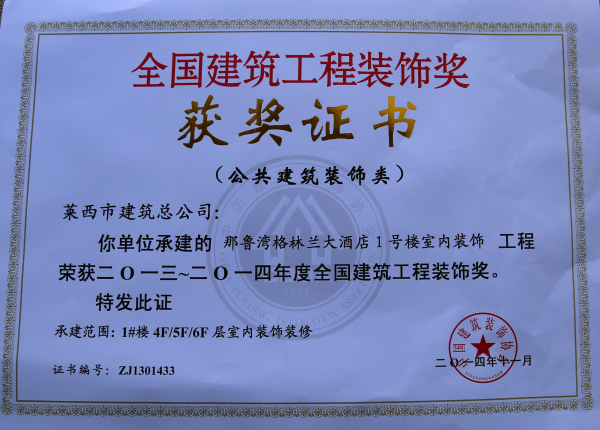 12月11日至12日,中国建筑装饰三十年纪念大会在北京国家会议中心隆重召开。住建部副部长王宁、中国建筑装饰协会会长李秉仁、秘书长刘晓一等领导到会。大会对2013—2014年全国装饰奖获奖单位进行了表彰。我公司施工的那鲁湾格兰大酒店1#楼室内装饰工程获奖。