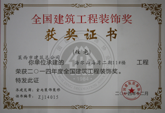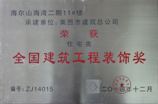 我公司施工的海尔山海湾二期11#楼工程荣获2014年度全国建筑工程装饰奖