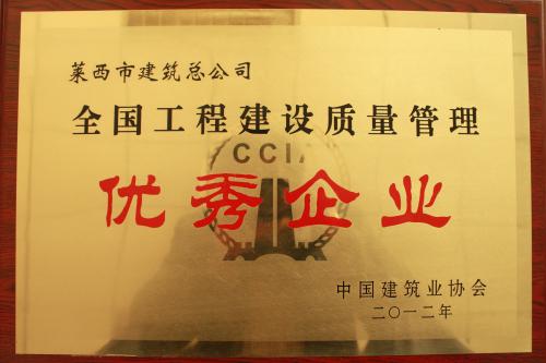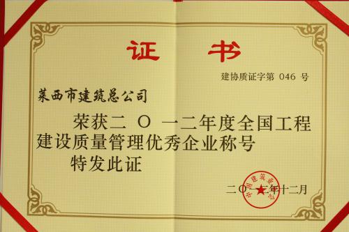 我公司荣获2012年度全国工程建设质量管理优秀企业