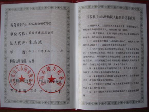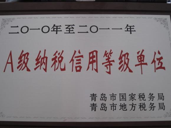 2013年4月17日,莱西市国家税务局、莱西市地方税务局领导一行6人,专程到我公司颁发了青岛市国家税务局、青岛市地方税务局《A级纳税信用等级单位》牌匾和证书,这是我公司第二次获此殊荣。