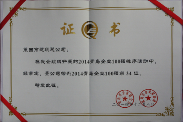我公司名列青岛企业100强第34位