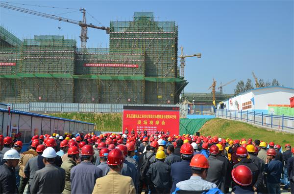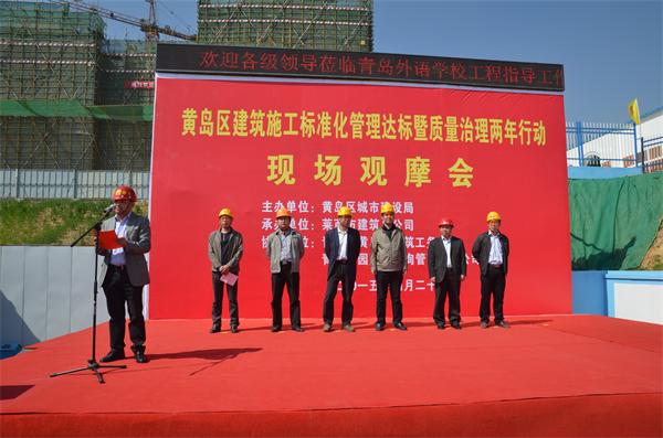2015年4月22日上午,黄岛区建筑施工标准化管理达标暨质量治理两年行动现场观摩会在我公司孙有建项目部、颜坤项目部所施工的青岛外语学校工程召开。青岛市建管局总工程师孙宪阁,黄岛区建管办主任张伟,区质监站副站长李占勇,区建筑工务局副局长王城明,青岛高园建设咨询管理有限公司总经理戚林立,我公司总经理赵成福出席了本次观摩会。