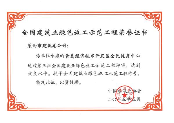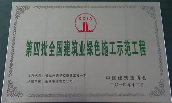 2015年5月13日,全国建筑业绿色施工经验交流会暨2014年度全国建设单位及工程项目节能减排达标竞赛活动表彰大会、第四批全国建筑业绿色施工示范工程授牌大会在北京召开。我公司施工的全民健身中心工程通过全国第三批全国建筑业绿色施工示范工程评审,被授予“全国建筑业绿色施工示范工程”称号;青岛外语学校新建工程一期、德国企业中心项目、青岛万科广场工程、凯丰国际广场—城市微客厅、汉峪金融商务中心A7地块一标段等五项工程荣获第四批“全国建筑业绿色施工示范工程”。