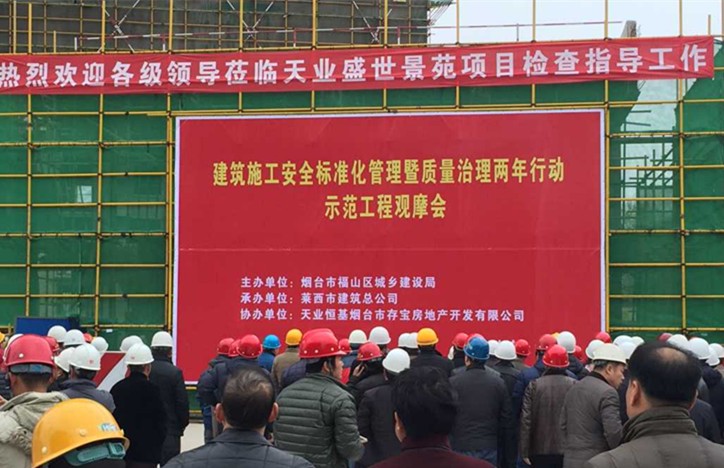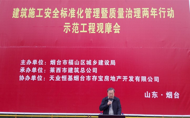 12月1日,烟台市福山区城乡建设局主办的烟台市“建筑施工标准化管理暨建筑工程质量治理两年行动”示范工程观摩会在七公司仲涛项目部施工的天业盛世景苑召开。烟台市质检站站长刘辉生、福山区城乡建设局局长周道隆、分管副局长宋夕纯、福山区建管处主任蒋建、副主任牛成斌、天业恒基烟台存宝房地产有限公司总经理肖剑、七公司总经理吴克祥出席了观摩会。烟台市安全、质量机构负责人以及建设、监理、施工总承包共计143家单位、项目负责人参加了本次观摩会,观摩人员达300余人。