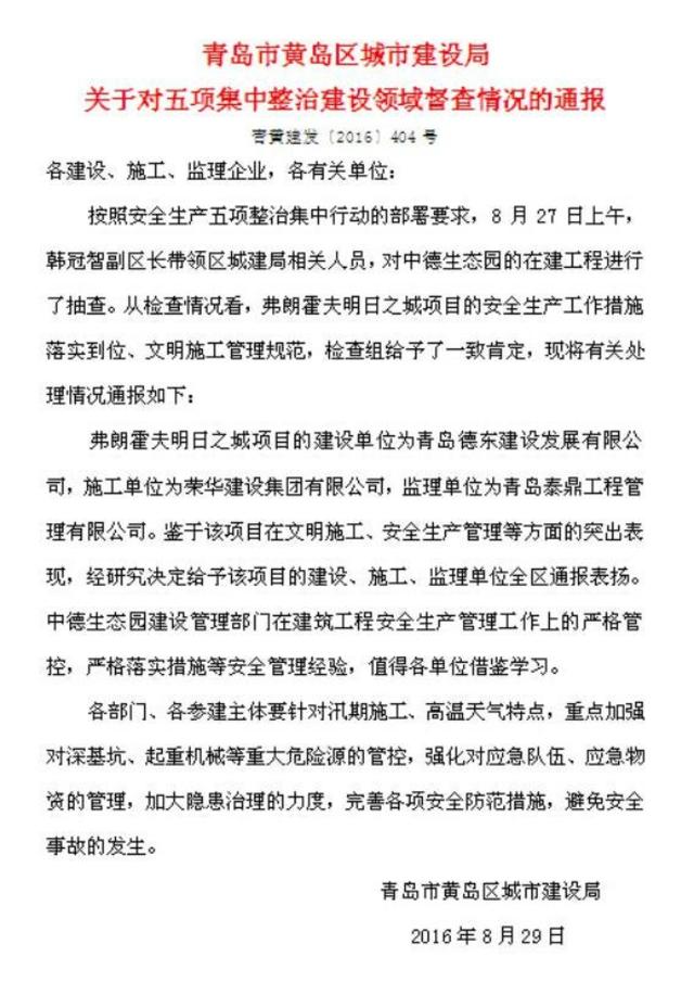 弗朗霍夫明日之城项目 受到黄岛区城市建设局通报表扬