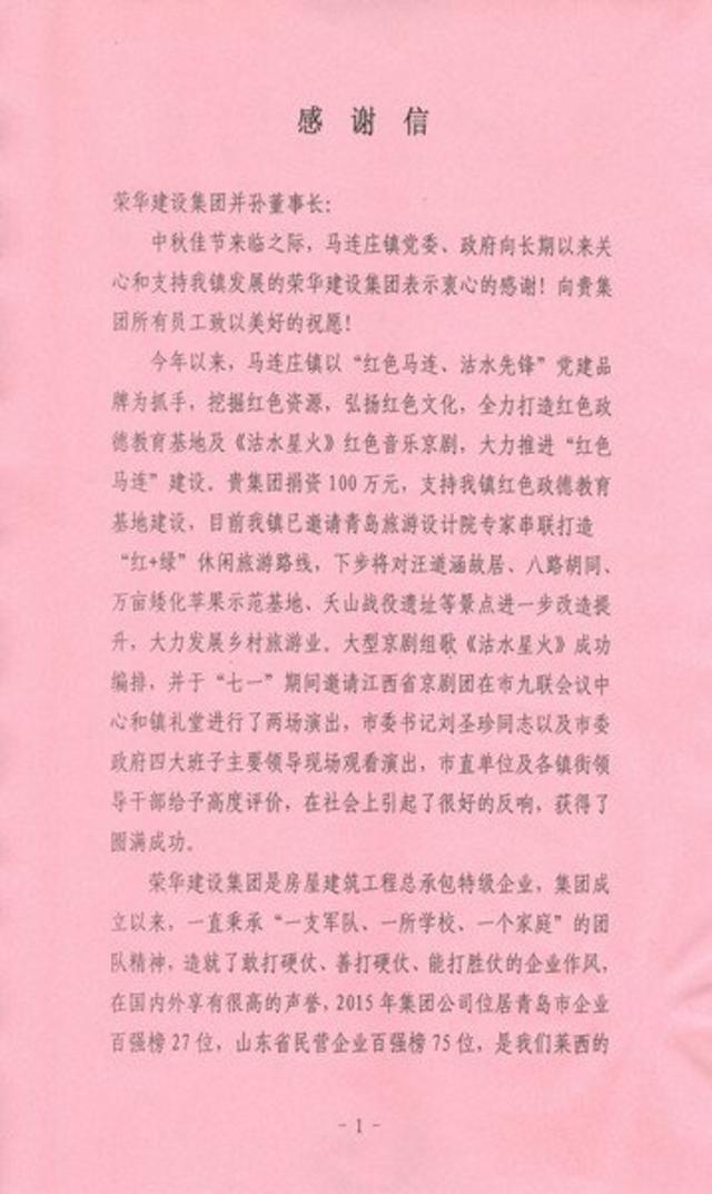 马连庄镇以“红色马连、沽水先锋”党建品牌为抓手,挖掘红色资源,大力弘扬红色文化。我集团公司为助力马连庄镇的党建发展特捐资100万元,促进马连庄镇红色政德教育基地建设,推动其“红+绿”休闲旅游建设。马连庄镇党委、政府为感谢荣华建设集团,在中秋佳节来临之际,党委书记徐兆华等领导专门送来《感谢信》,感谢我集团公司在发展壮大的同时,不忘为家乡发展做贡献,服务社会,投身公益事业,在企业界树立了良好的公益榜样。