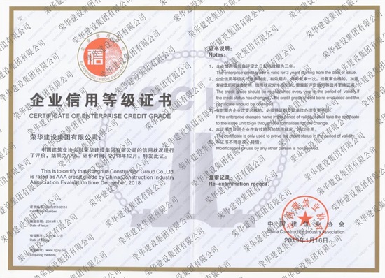 近日中国建筑业协会对我集团信用状况进行了专业化考评,我集团凭借优异的经营管理能力、良好的社会诚信,评定结果为AAA级,蝉联“全国建筑业AAA级信用企业”。