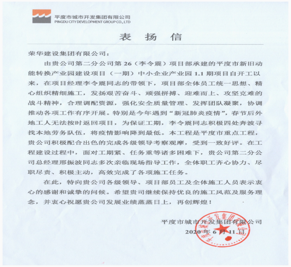 近日,集团公司总部收到平度市城市开发集团有限公司发来的表扬信,对二公司李令震项目部施工的平度市新旧动能转换产业园建设项目(一期)中小企业产业园1.1期项目提出表扬。