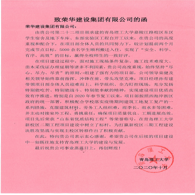 由宝利公司孙有建项目部承建的青岛理工大学嘉陵江路校区东区学生宿舍及地下车库、东部试验区工程,自开工以来,面对施工现场条件复杂,施工技术难度大等诸多不利因素,在项目部全体人员的共同努力下,提前两个月完成节点目标,5000余名学生顺利搬迁入住,赢得了全校师生的一致好评。为青岛理工大学新校区二期工程建设中树立了标杆。特此青岛理工大学党委副书记杨兴昌送来锦旗及表扬信,以感谢集团公司在参与校区建设中做出的贡献。