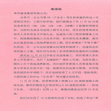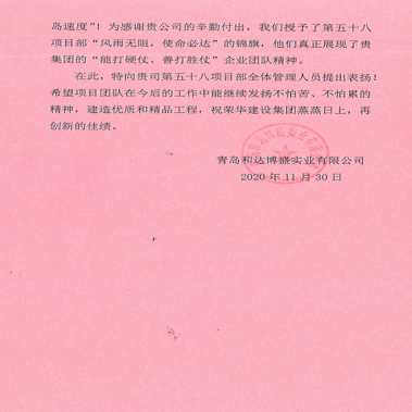 近期,集团公司总部收到青岛和达博盛实业有限公司发来的表扬信,对一公司第五十八(于全志)项目部施工的和达可园商住项目提出表扬。