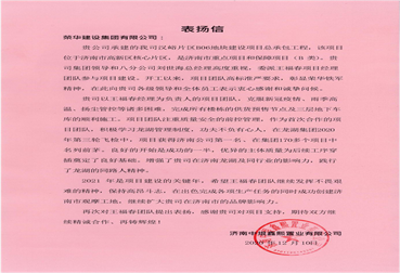 近日,集团总部收到济南中垠鑫熙置业有限公司发来的表扬信,对八公司第三十八(王福春)项目部施工的汉峪片区B06地块建设项目总承包工程提出表扬。