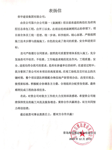 近期,集团总部收到青岛海信博远置业有限公司发来的表扬信,对六公司第一(栾渊博)项目部施工的海信红岛府高层区总承包工程提出表扬。