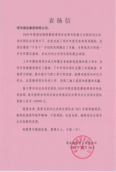 近日,集团公司总部收到青岛裕桥置业有限公司发来的表扬信,对五公司第二十七(刘云杰)项目部施工的国信裕桥墨悦湾项目提出表扬。