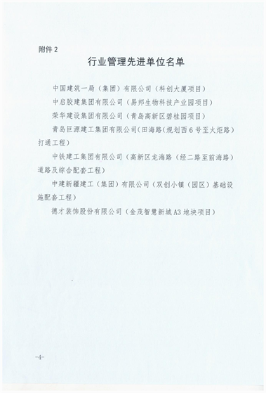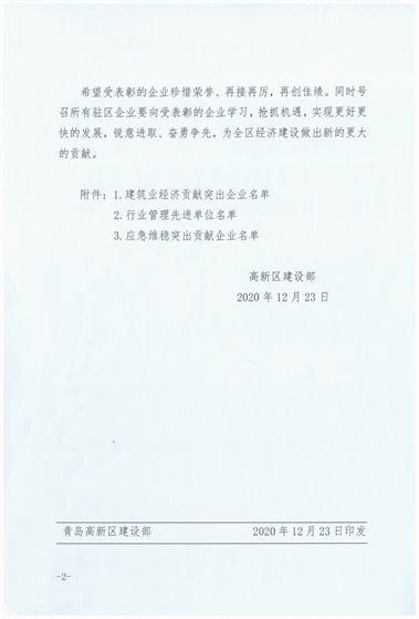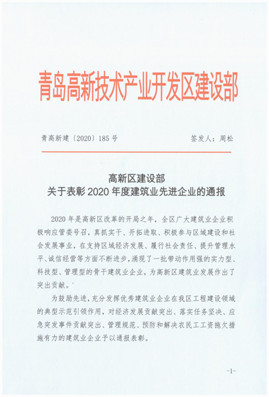 近期,青岛高新区建设部发布《关于关于表彰2020年度建筑业先进企业的通报》,三公司第十六(王慎平)项目部施工的青岛高新区碧桂园项目综合管理水平优异,为集团公司赢得“行业管理先进单位”称号,并对集团公司在重大活动、应急保障、清欠维稳方面做出的突出贡献进行表彰。 希望各项目部带领团队继续保持优良的施工风范及服务理念,勇于担当社会责任,为集团公司创造更多优质工程。同时号召各项目部要互相学习,开拓创新,更创佳绩!