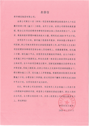 近期,集团公司收到青岛市黄岛街道办事处发来的表扬信,对开发区公司第五十四(李伟)项目部施工的黄岛街道岛外九个社区搬迁改造工程(施工)三标段项目提出表扬。