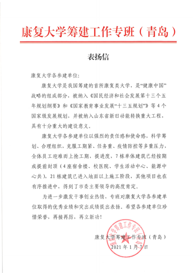 八公司第二(商俊尧)项目部受到康复大学表扬