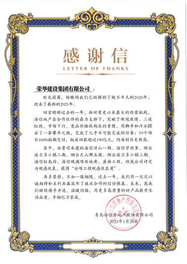 近日,集团公司收到青岛海信房地产股份有限公司发来的感谢信,对过去一年与集团公司的通力合作表示衷心的感谢。