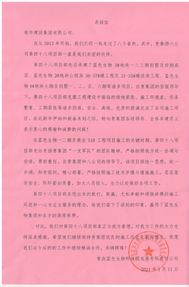近日,集团总部收到青岛蓝色生物科技园发展有限责任公司发来的表扬信,对八公司第四十八(郝中华)项目部施工的蓝色生物3#地块一二三期别墅及四期高层、蓝色生物2#地块公租房36-37#楼工程及31-35#楼改造工程、蓝色生物4#地块7期及别墅一、二、五、六期等诸多项目提出表扬。