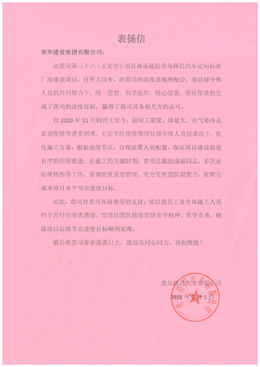 四公司第三十六(王宏宇)项目部受到青岛路昌汽车有限公司表扬