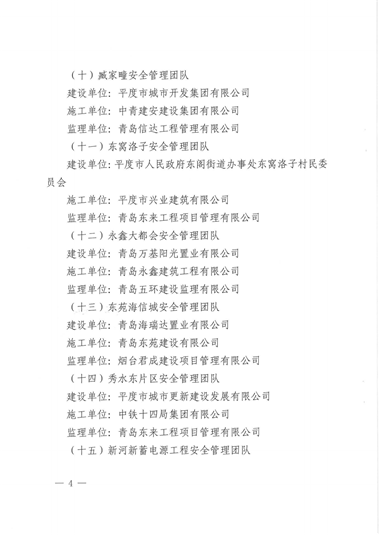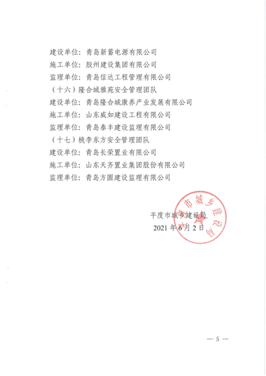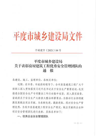 集团总部受到平度市城乡建设局关于表彰房屋建筑工程优秀安全管理团队的通报
