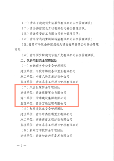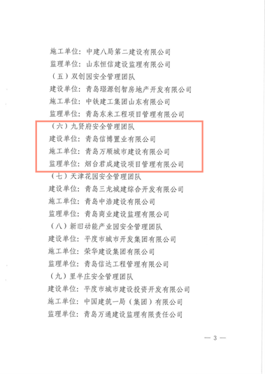 近日,平度市城乡建设局发布了关于表彰房屋建筑工程优秀安全管理团队的通报,其中四公司第四十一孙承学项目部施工的平度市海信九贤府项目和二公司第十五李一项目部施工的海信凤台世家项目被评为优秀项目安全管理团队,为集团公司赢得了荣誉。 希望项目部继续精益求精,坚持不懈,发扬不怕苦、不怕累的工作精神,用更多高质量的好产品提升生活品质、幸福亿万家庭!