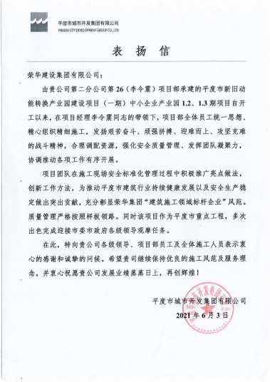 近期,集团总部收到平度市城市开发集团有限公司发来的表扬信,对李令震项目部施工的平度市新旧动能转换产业园建设项目(一期)中小企业产业园1.2、1.3期项目提出表扬。