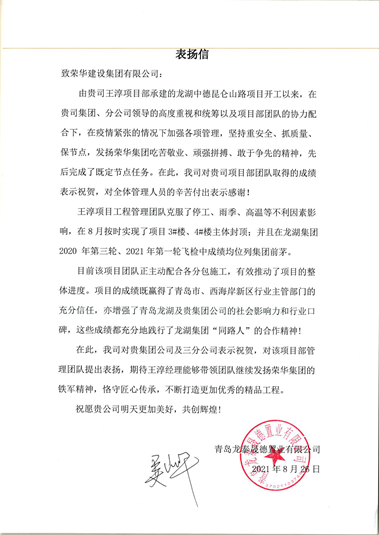 近期,集团总部收到青岛龙泰晟德置业有限公司发来的表扬信,对三公司王淳项目部施工的龙湖中德昆仑山路项目提出表扬。