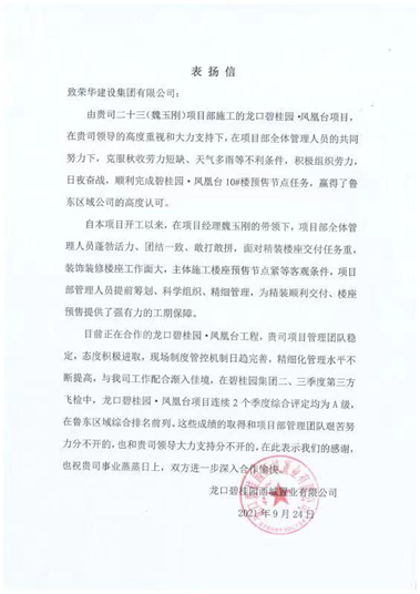 近日,集团公司收到龙口碧桂园西城置业有限公司发来的表扬信,对七公司魏玉刚项目部施工的龙口碧桂园•凤凰台项目提出表扬。