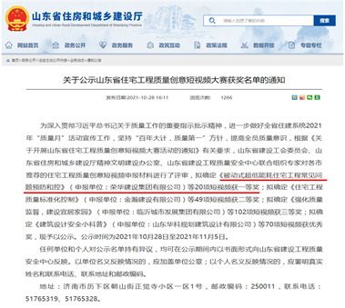 近日,山东省住房和城乡建设厅公示了山东省住宅工程质量创意短视频大赛获奖名单,确定241项作品获奖,其中三公司王淳项目部《被动式超低能耗住宅工程常见问题预防和控制》荣获一等奖第一名,六公司刘辉项目部《精装修交付渗漏开裂防控》获得二等奖,荣华(青岛)建设科技有限公司《装配式混凝土建筑质量控制要点》获得三等奖。