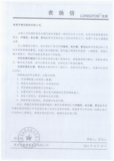 近日,集团公司收到青岛龙泰博睿置业有限公司发来的表扬信,对一公司何瑞进、赵长操、管志红等项目部施工的青岛龙湖闫家岭学樘府一期项目提出表扬。