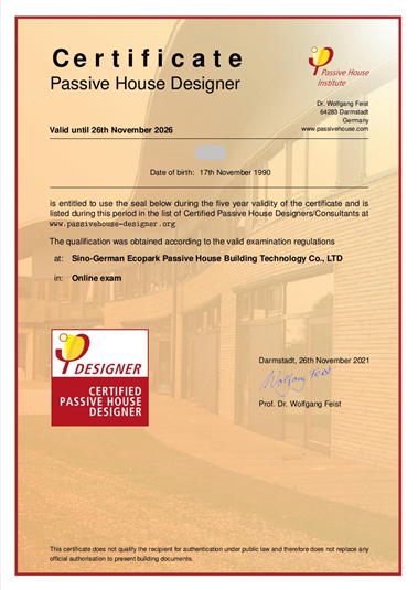 11月27日,经过为期4天的脱岗式研学、持续4个小时的远程视频线上考试,集团公司聂建卫、李海生、于海洋、陈凯、杨辉等5名同志顺利通过了PHI(德国被动房研究所)被动房设计师认证考试。