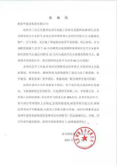 2021年11月20日,集团公司收到青岛锦裕置业有限公司发来的表扬信,对三公司第九(董秀远)项目部施工的青岛龙湖薛家滩项目提出表扬。