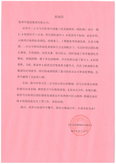 二公司第十(马呈阳)项目部受到青岛龙华盛锦置业有限公司表扬