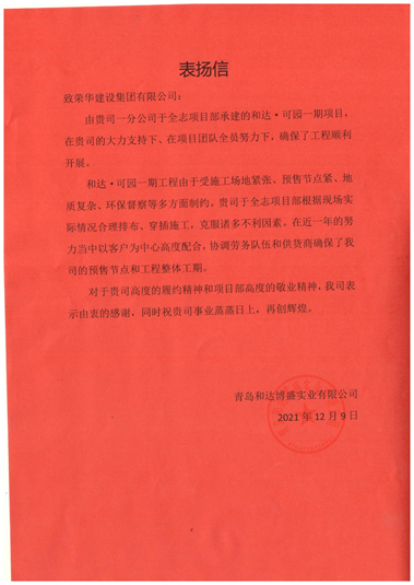 一公司第五十八(于全志)项目部受到 青岛和达博盛实业有限公司表扬