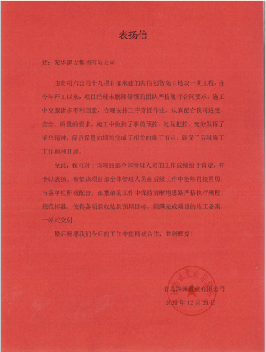 六公司第十九(宋鹏翔)项目部受到 青岛海诚置业有限公司表扬