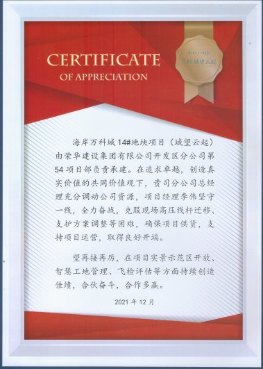 开发区公司第五十四(李伟)项目部受到 万科城望云起项目部表扬