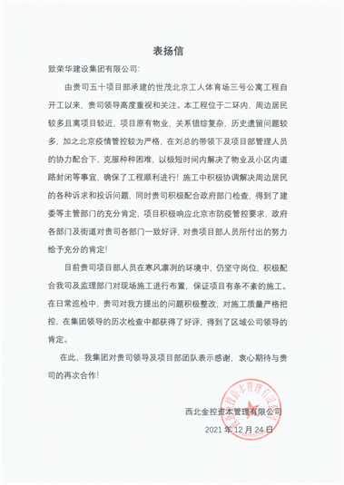 近日,集团公司收到西北金控资本管理有限公司发来的表扬信,对八公司史宝座项目部施工的世贸北京工人体育场三号公寓工程提出表扬。
