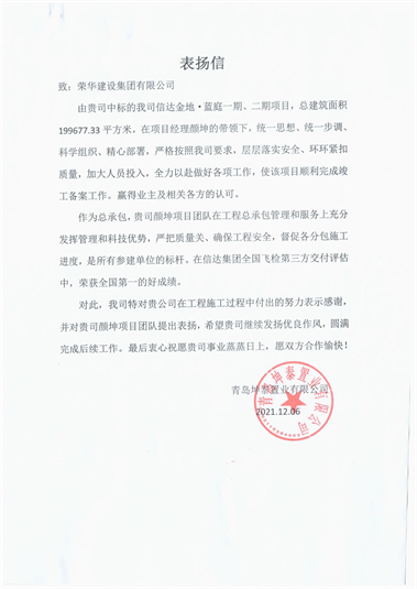 开发区公司第43(颜坤)项目部受到 青岛坤泰置业有限公司表扬