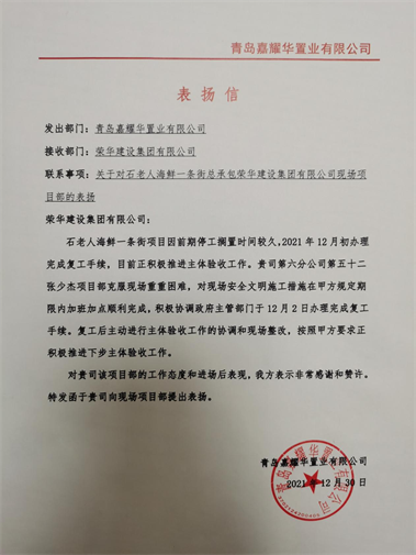 近日,集团公司收到青岛嘉耀华置业有限公司发来的表扬信,对六公司张少杰项目部施工的石老人海鲜一条街项目工程提出表扬。
