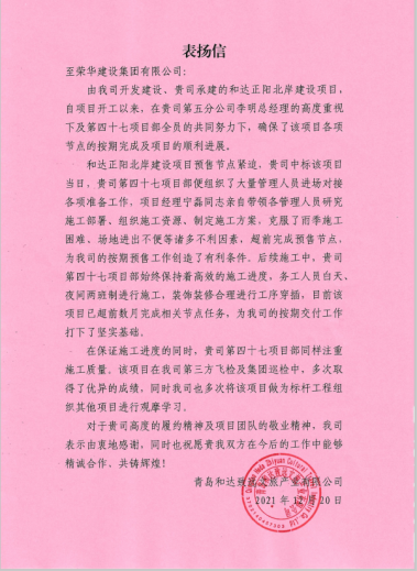 近日,集团公司收到青岛和达致远文旅产业有限公司发来的表扬信,对五公司第四十七项目部施工的和达正阳北岸建设项目提出表扬。