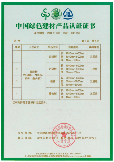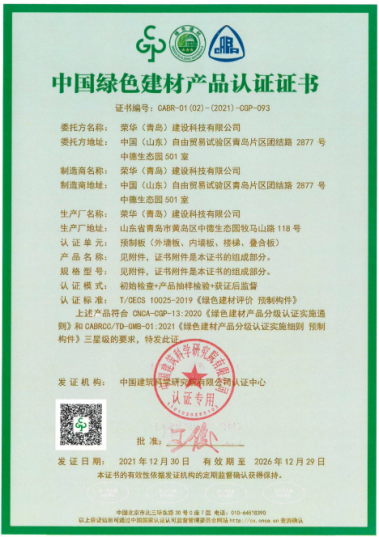 2021年12月30日,荣华(青岛)建设科技有限公司顺利通过山东省首批装配式混凝土结构预制构件(预制墙板、预制楼板、预制楼梯)“绿色建材三星级认证”。
