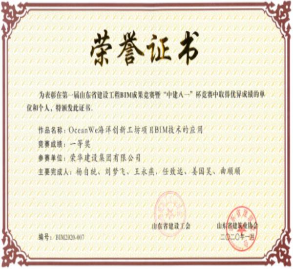 集团公司《OceanWe海洋创新工坊项目BIM技术应用》,荣获山东省建设工会、山东省建筑业协会举办的第一届山东省建设工程BIM成果竞赛暨“中建八一”杯竞赛一等奖。