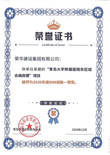 2020年12月16日,青岛市建设智能化协会举办的关于2020年度“十佳优秀企业”评选活动,集团BIM中心报送的“青岛大学附属医院东院病房楼”、“海尔云谷”以及“黑卓中心”项目分别获得2020年度BIM创新一等奖、二等奖和优秀奖,同时,集团公司被评选为2020年度“十佳优秀企业”。